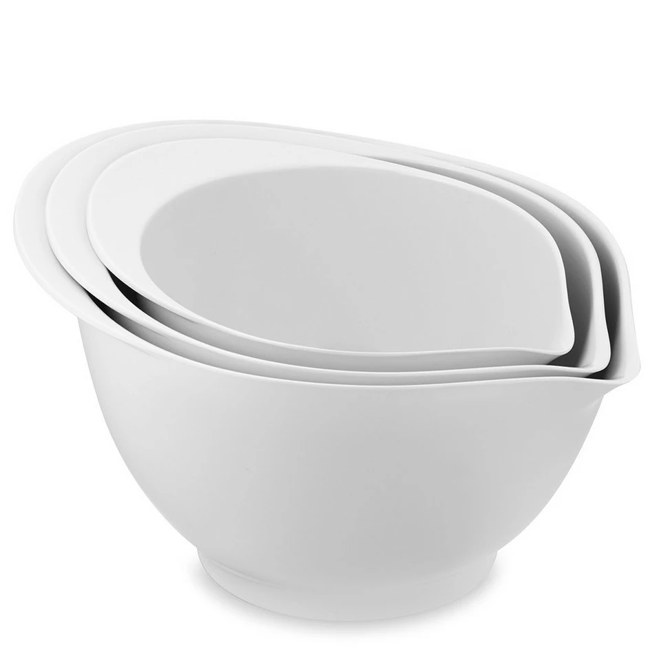 These melamine mixing bowls have pour spouts, making them ideal for neatly transferring batter to baking pans or hot griddles. Lightweight and virtually unbreakable, melamine is tough enough for everyday use – and a great choice for kid cooks who like to help in the kitchen.