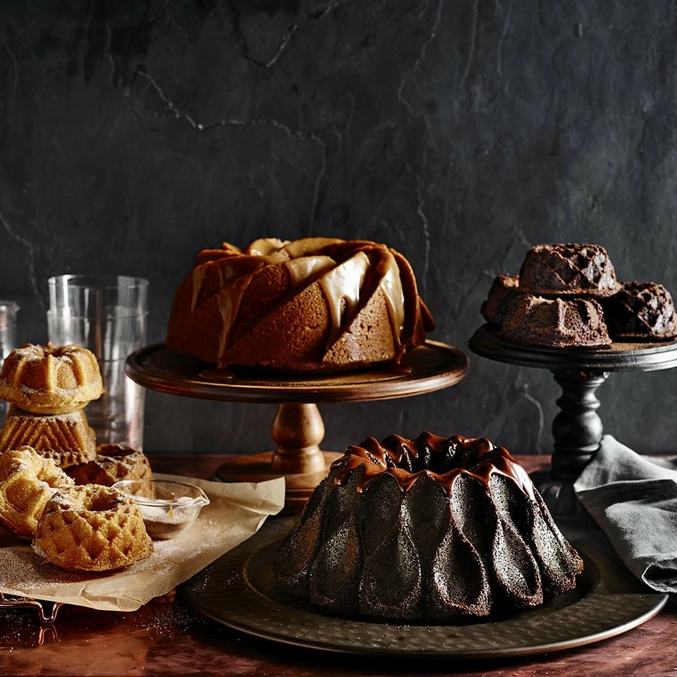 Created in honour of Nordic Ware’s 70th anniversary, this baking plaque produces six cakelets in three beautifully detailed shapes that draw from the company’s seven decades of unique Bundt® pan designs. A non-stick finish guarantees smooth release, so every ridge and curve remains well defined and ready for decoration – all the cakelets need is a simple glaze or sprinkling of icing sugar.