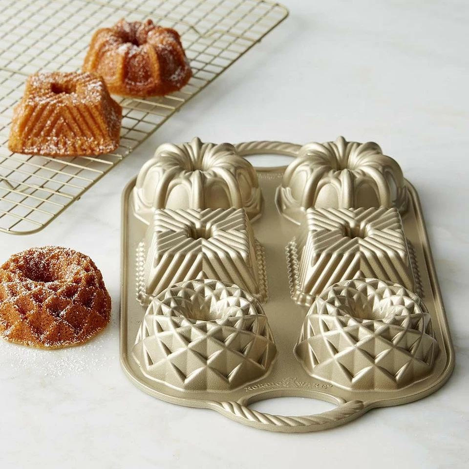 - Commercial-quality pan produces six charming mini Bundt® cakes in three different designs.