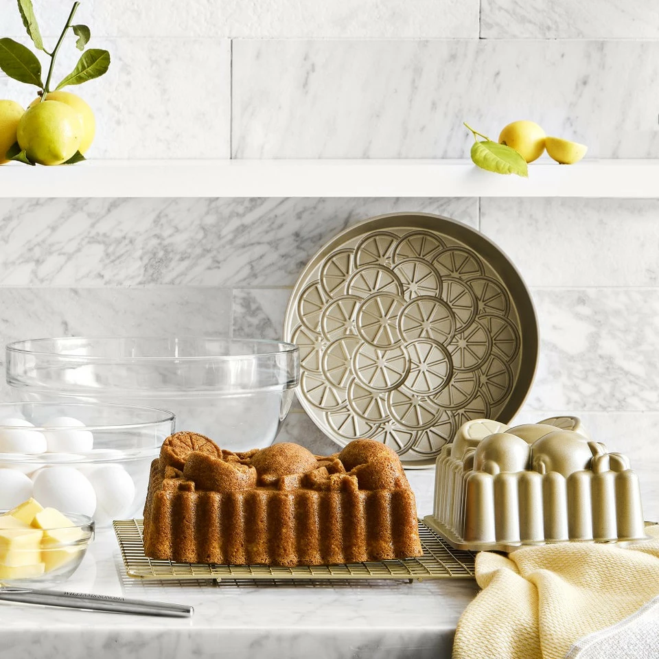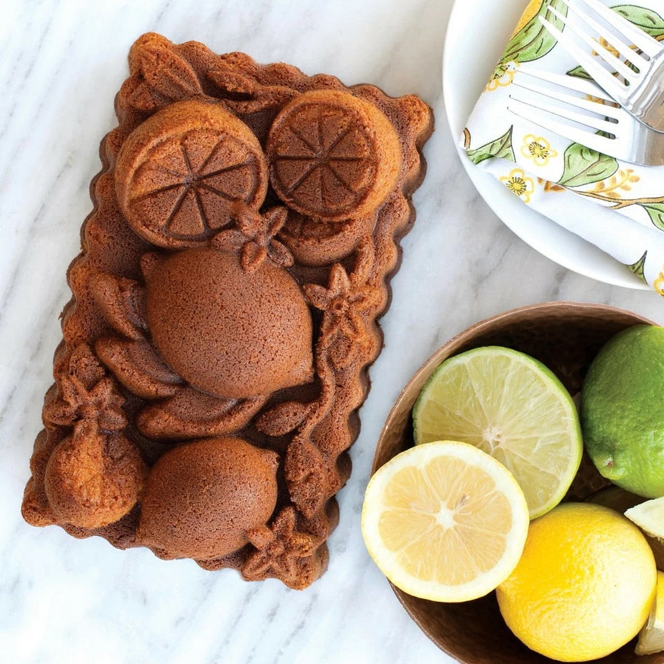 Citrus tea cakes gain new dimension baked in Nordic Ware’s sculptural pan. Made in the USA of nonstick cast aluminium, it produces a perfectly baked cake with stunning three-dimensional detailing.