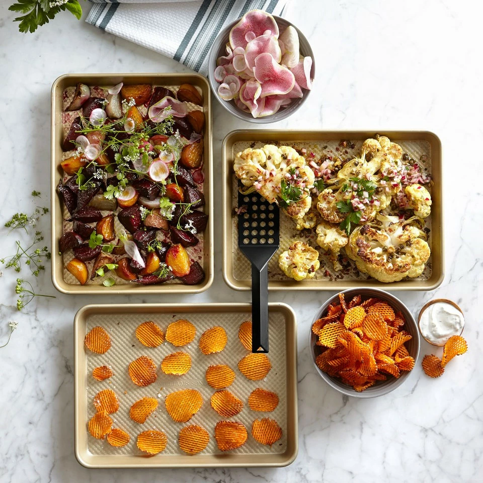 Our quarter-sheet pans are ideal for baking small batches of cookies or heating up food in the oven. Crafted of aluminised steel with a diamond-textured surface for enhanced strength and airflow, these commercial-quality pans feature our advanced Goldtouch® Pro non-stick coating for easy release and quick clean-up.