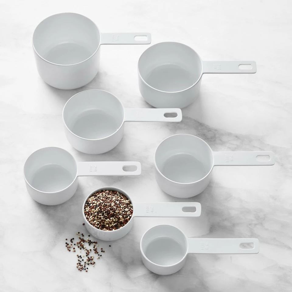 - Set of 7 cups includes: 1/4 cup, 1/3 cup, 1/2 cup, 2/3 cup, 3/4 cup, 1 cup and 1 1/2 cup.