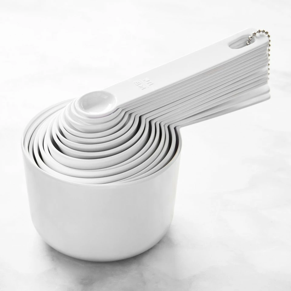 Essential for everyday baking, these measuring cups and spoons offer exceptional utility and durability at a great value. Made from BPA-free melamine, each one is shatterproof, resistant to odors and dishwasher safe. The entire set of 14 nests for compact storage. The sets of seven nests for compact storage.