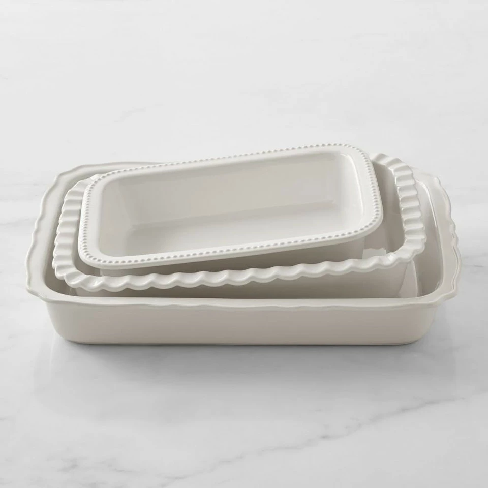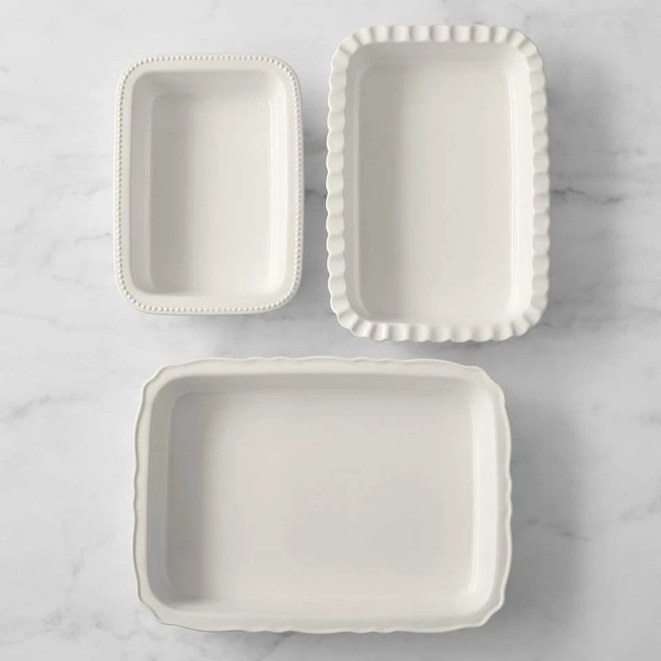 Vintage style meets stoneware functionality in these gorgeous bakers. Crafted of sturdy glazed stoneware, these bakers conduct heat evenly for uniform browning, making them perfect for everything from casseroles and vegetable gratins to fruit cobblers and crisps. Each white baker is made for beautiful oven-to-table presentation with a different rim style, including beaded, fluted and scalloped designs. The bakers neatly nest inside each other for compact storing.
